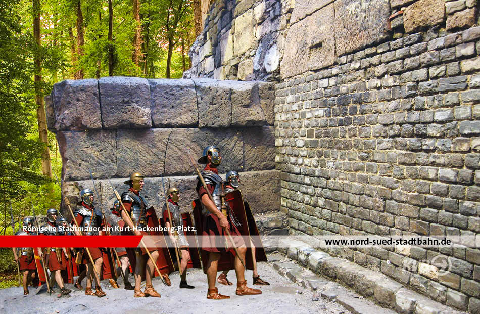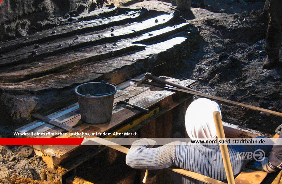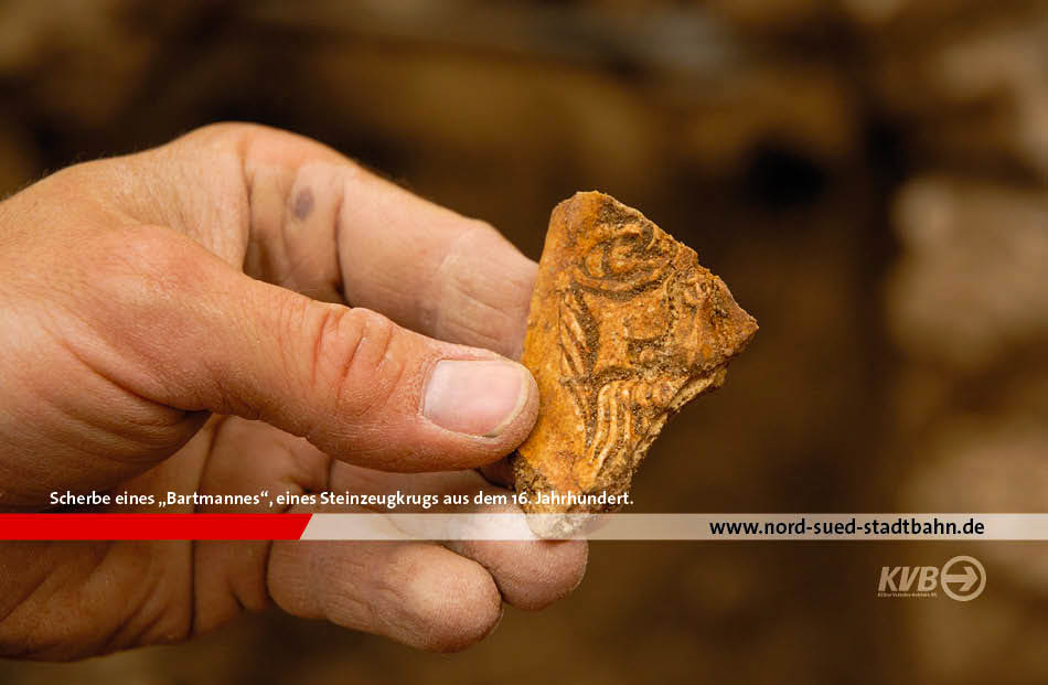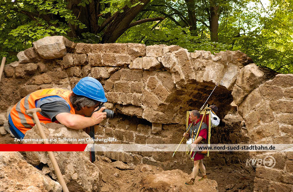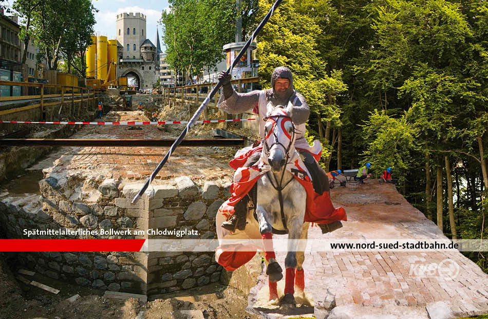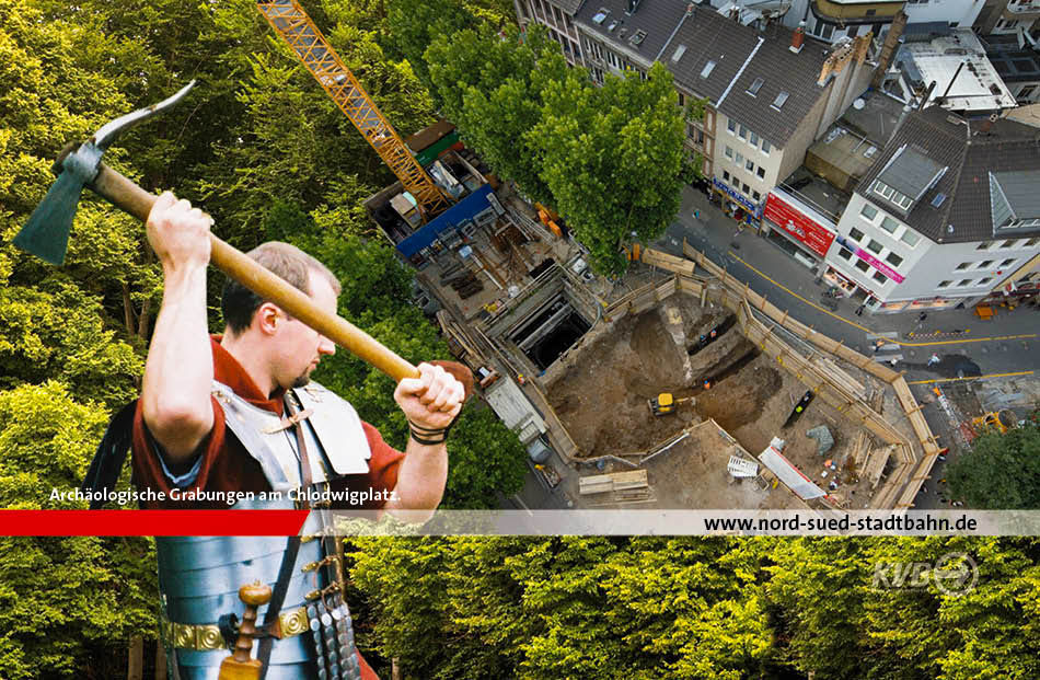 Tiefbauarbeiten in Köln durchdringen nahezu immer archäologische Schichten der 2000 Jahre alten Stadt. Daher gingen dem U-Bahn Bau umfangreiche archäologische Grabungen voraus. Deren Funde wurden auf den Schutzzäunen am Chlodwigplatz thematisiert.