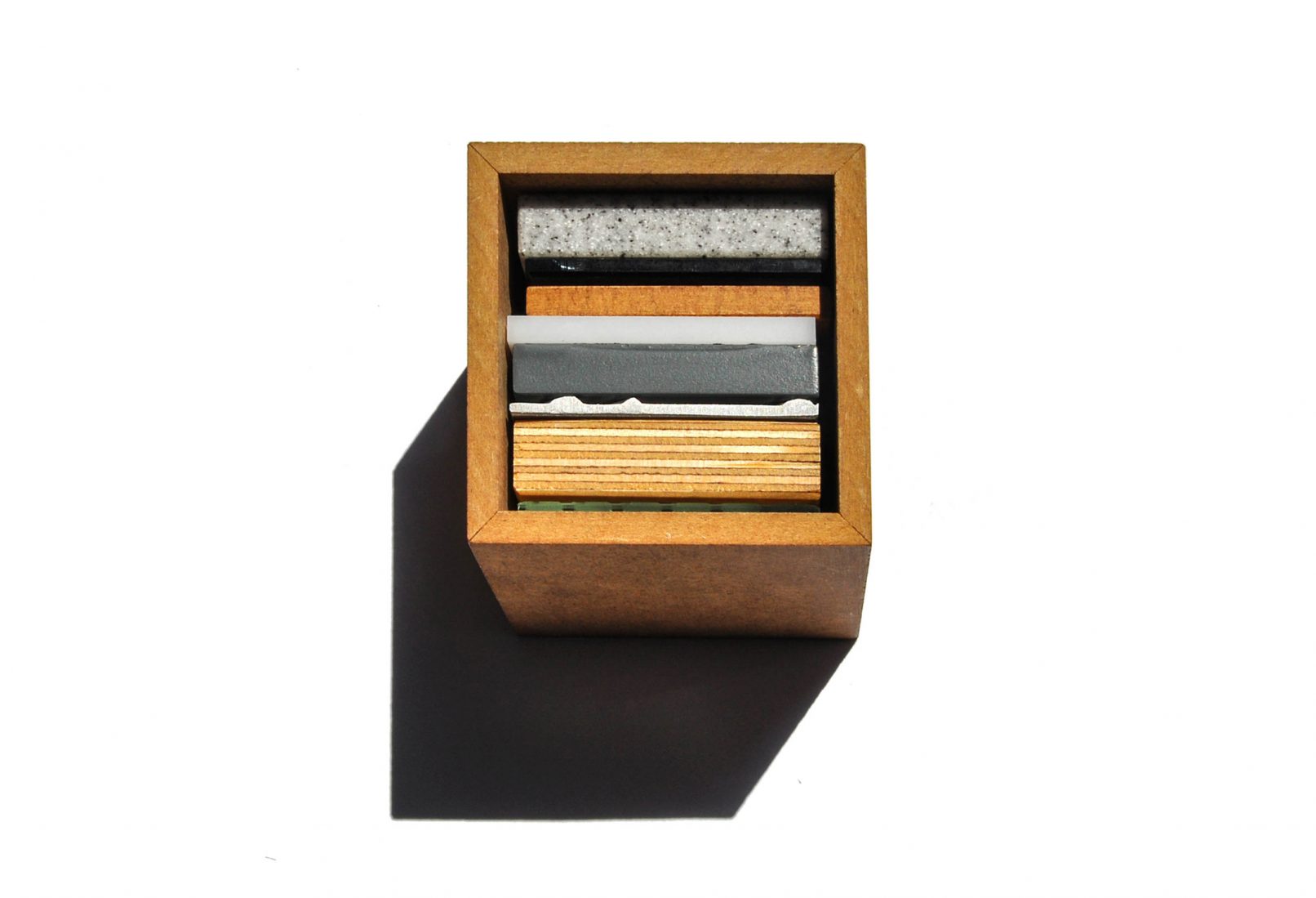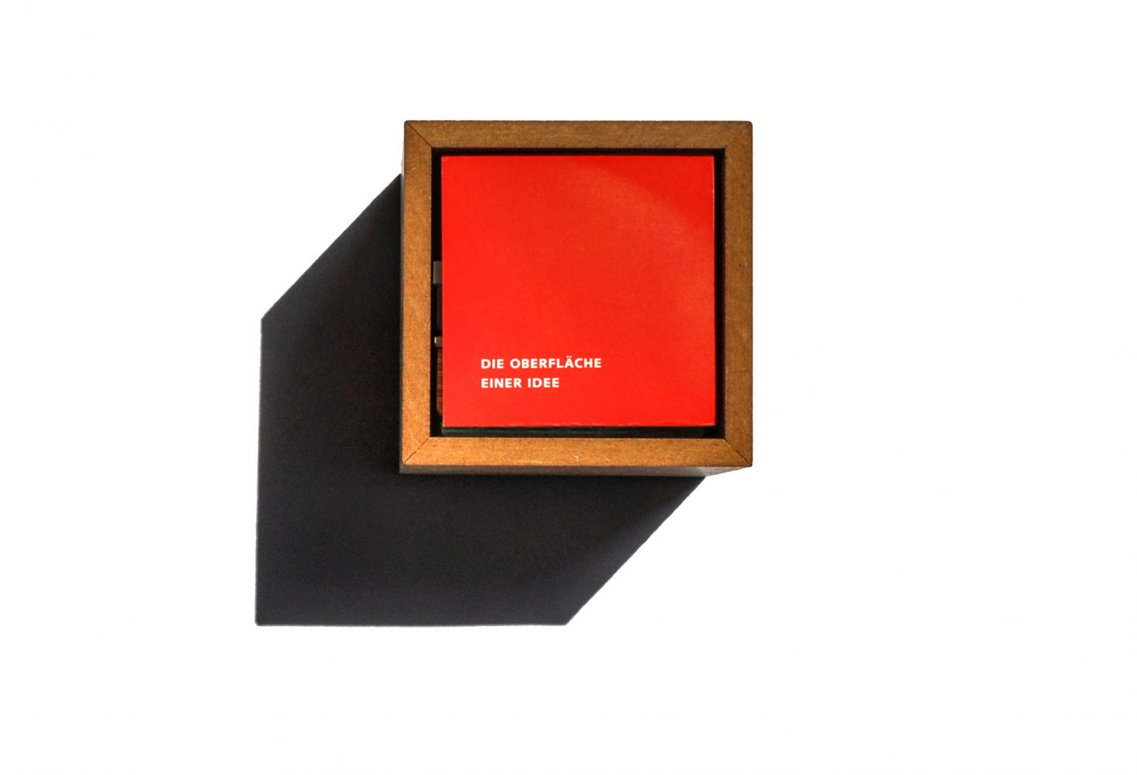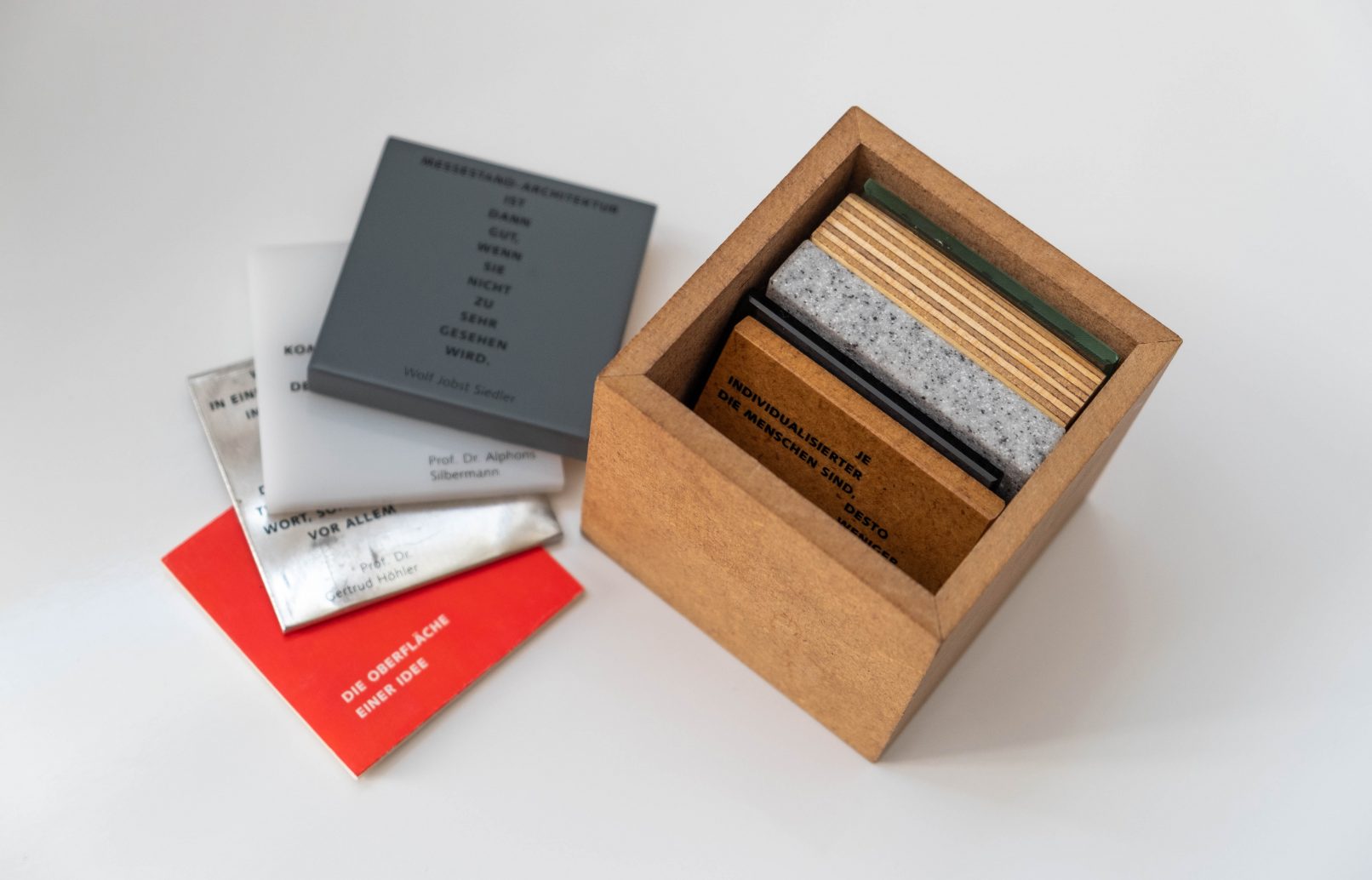 Dazu wurden die entsprechenden Materialproben in quadratische Plättchen geschnitten, mit Zitaten bedruckt, gestapelt und zu einem Würfel aufgeschichtet.